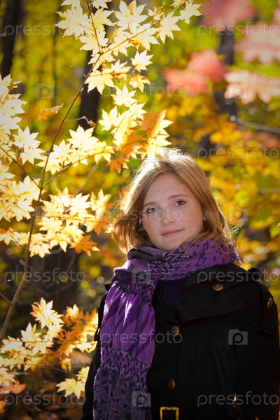 Молодая девушка на фоне осенних кленовых деревьев