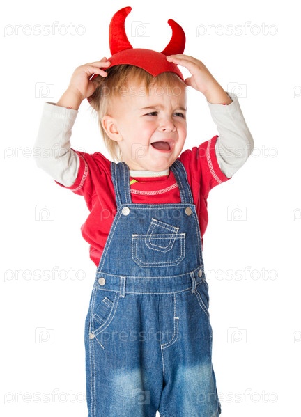 Плачущий мальчик в красной шапке с рогами, изолирован на белом фоне