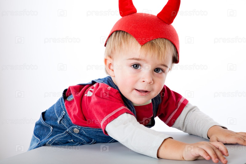 Мальчик в красной шапке с рогами