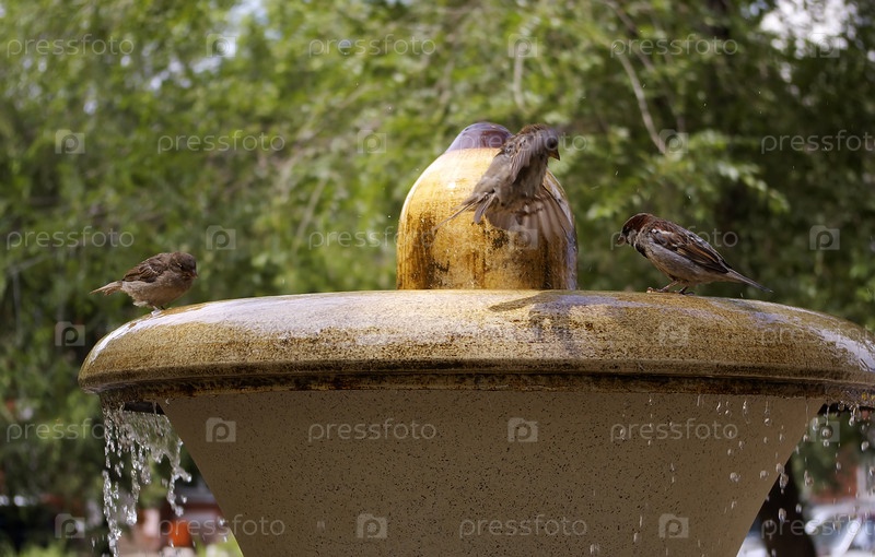 Воробьи, купающиеся в городском фонтане, Оренбург