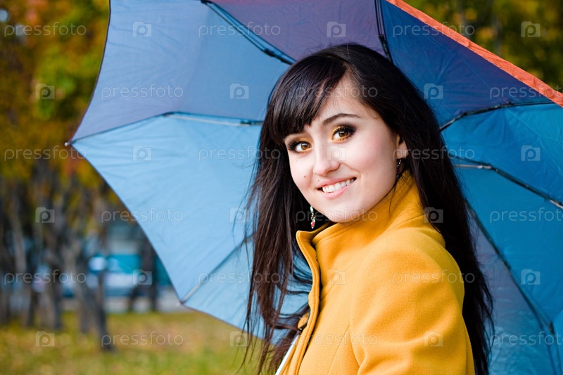 Портрет красивой брюнетки под зонтом в осеннем парке