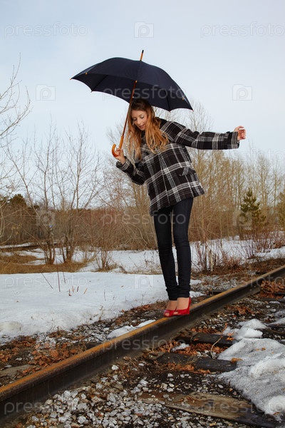 Красивая девушка с зонтиком идет по железной дороге