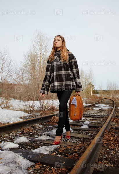 Красивая девушка с чемоданом идет по железной дороге