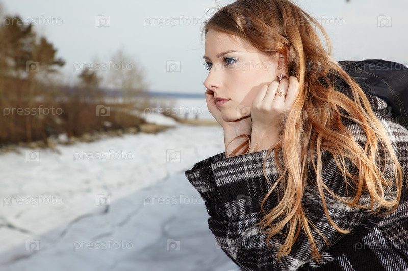 Красивая девушка на берегу реки зимой