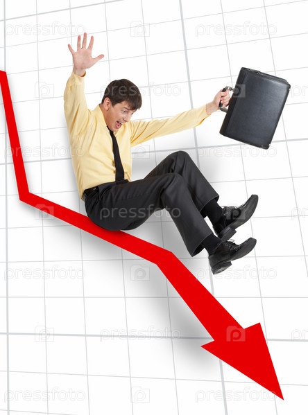 Бизнесмен скользит вниз по красной стрелке