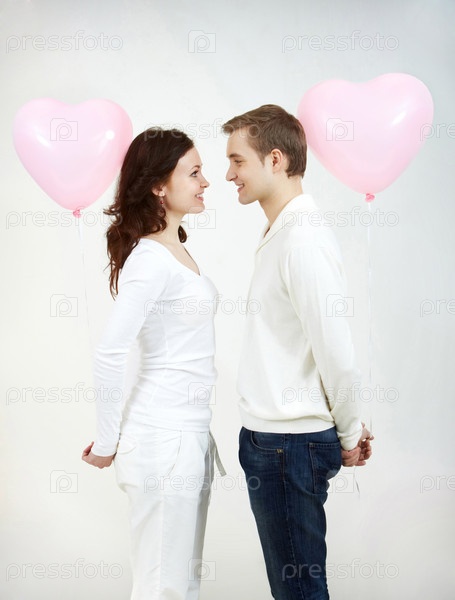 Влюбленная пара с воздушными шарами в форме сердца