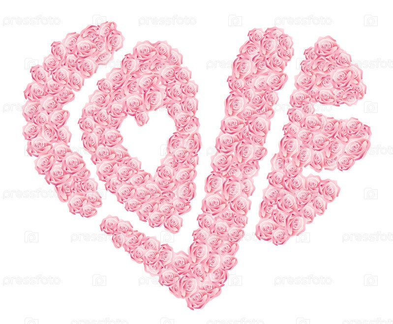 Надпись "Любовь" из роз в форме большого сердца на белом фоне