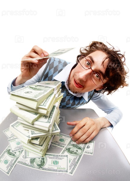 Мужчина строит башню из бумажных денег