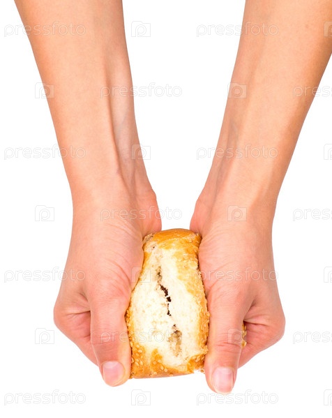 Руки разламывают булку, изолированы на белом фоне