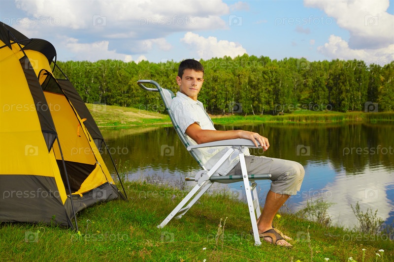 Мужчина сидит на складном стуле возле палатки. Лето