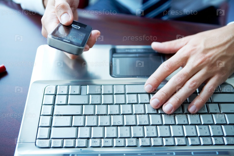Мужчина держит смартфон и печатает на клавиатуре