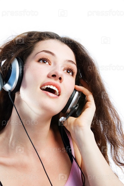 Девушка в наушниках на белом фоне