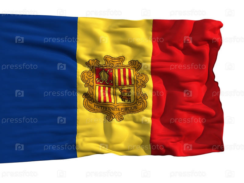 Флаг Андорры, развевающийся на ветру, изолирован на белом фоне