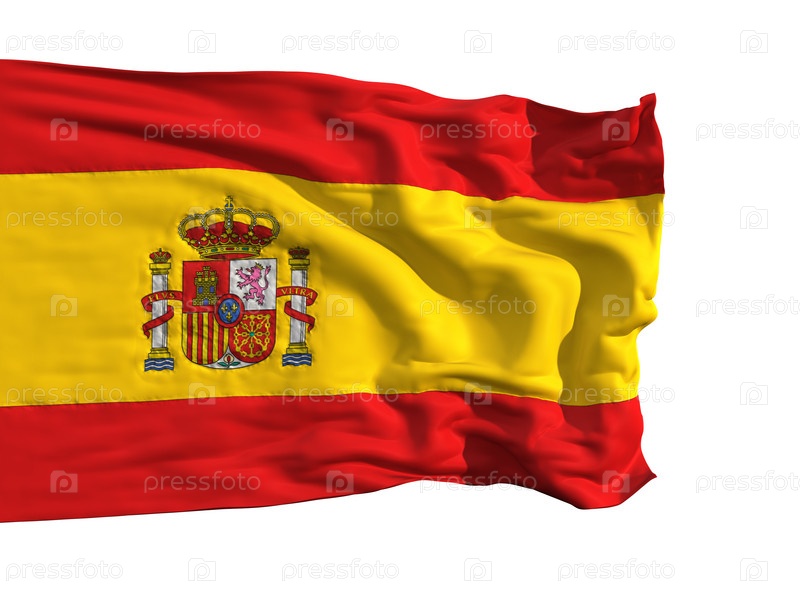 Флаг Испании, развевающийся на ветру, изолирован на белом фоне