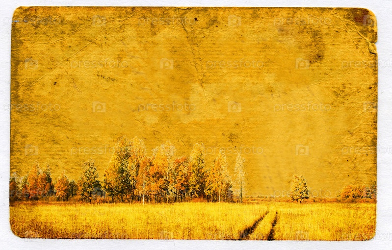 Осеннее поле с деревьями на старинной желтой фотографии