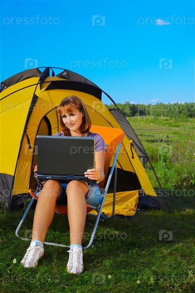 Счастливая женщина с ноутбуком сидит возле палатки