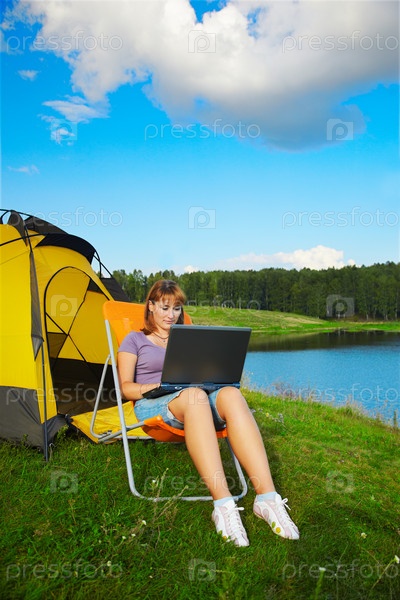 Счастливая женщина с ноутбуком сидит возле палатки