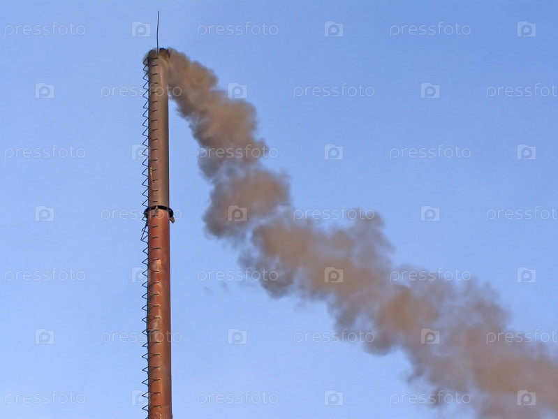 Серый дым из трубы на фоне голубого неба