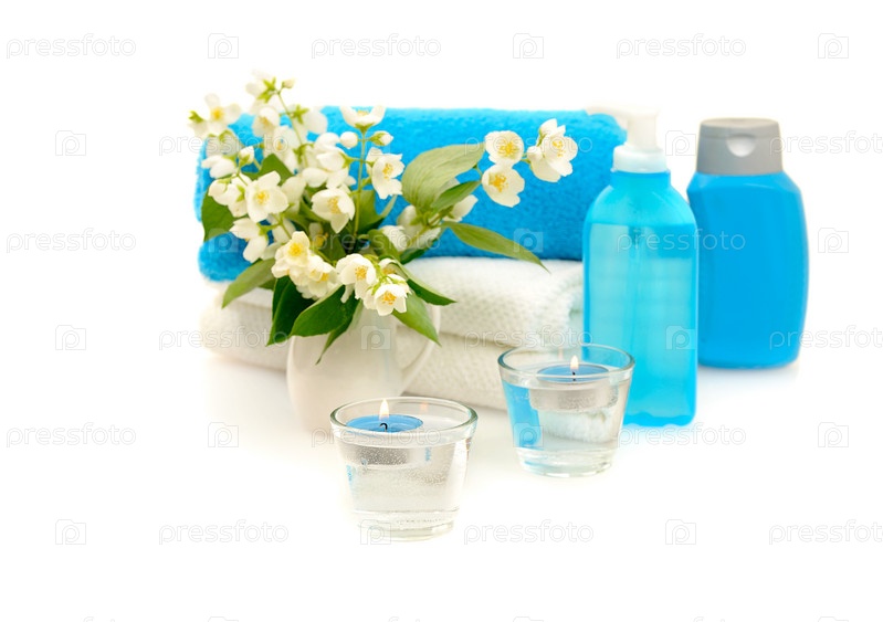 Средства для спа-процедур и цветок жасмина, изолированные на белом фоне