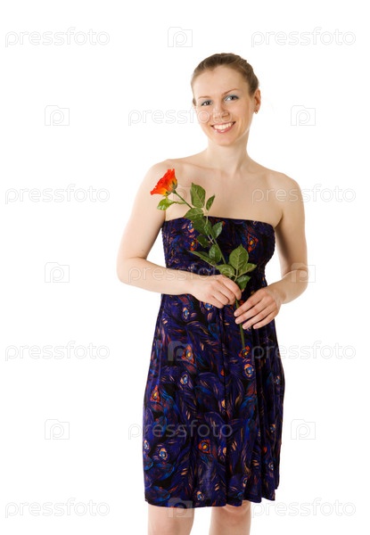 Портрет нарядной женщины с розой, на белом фоне