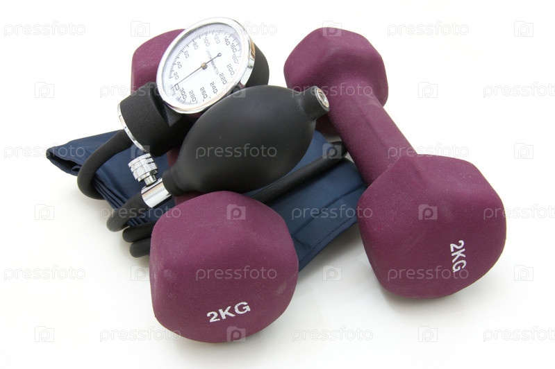 Тонометр и гантели на белом фоне