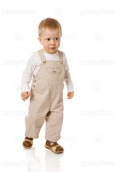 Двухгодовалый мальчик в комбинезоне идет, изолированный на белом фоне