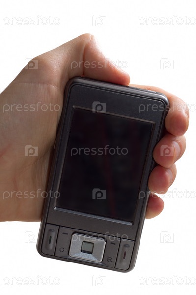 Рука с мобильным телефоном, крупный план на белом фоне