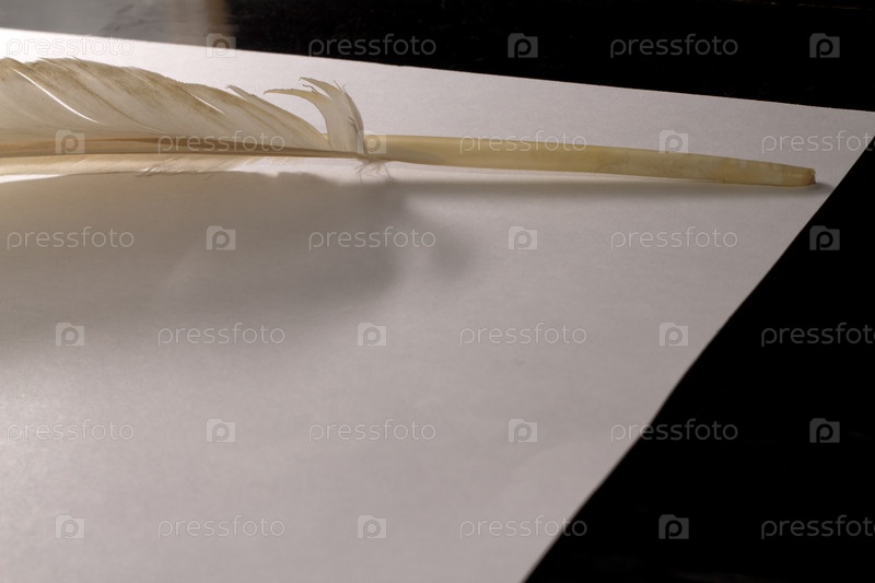 Перо и бумага для письма крупным планом, на черном фоне