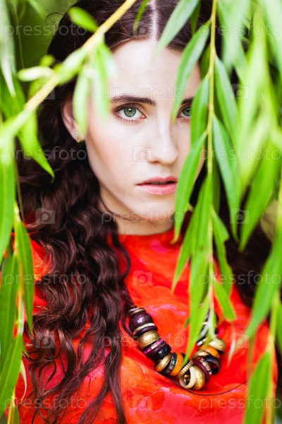 Красивая девушка в красном платье, смотрящая сквозь листву дерева