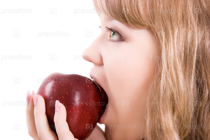 Девушка с зелеными глазами кусает большое красное яблоко