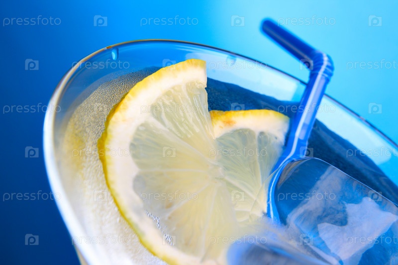 Коктейль с лимоном и кубиками льда крупным планом