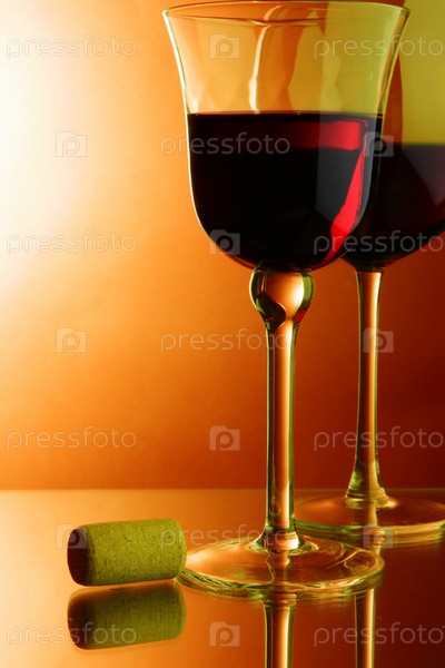 Два бокала красного вина и пробка