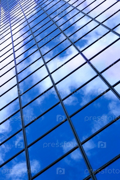 Стеклянная стена небоскреба с отражением облаков