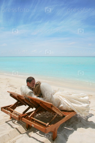 Молодожены лежат на шезлонгах на берегу океана, Мальдивские острова