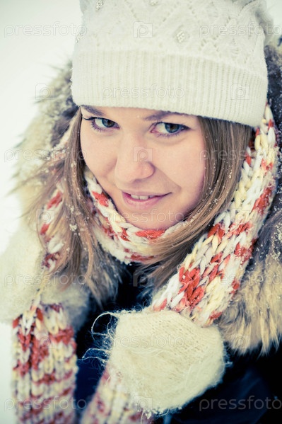Портрет счастливой девушки в запорошенной снегом зимней одежде, крупный план