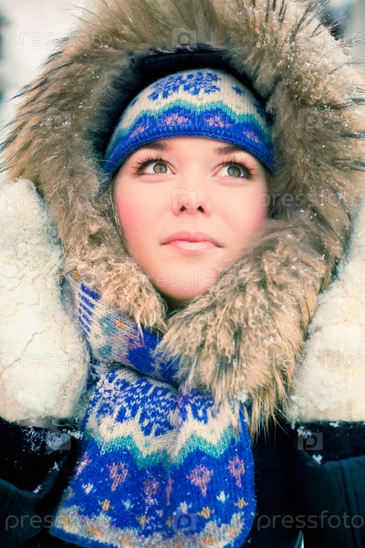 Портрет счастливой молодой женщины в запорошенной снегом зимней одежде, крупный план