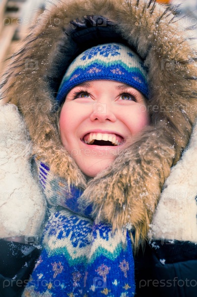 Портрет смеющейся молодой женщины в запорошенной снегом зимней одежде, крупный план