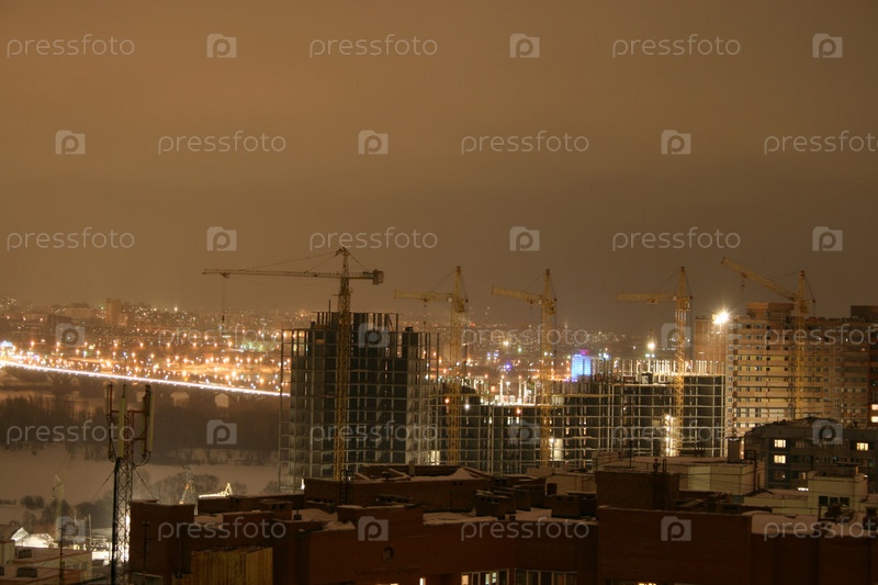 Недостроенные дома и строительные краны на фоне ночного города