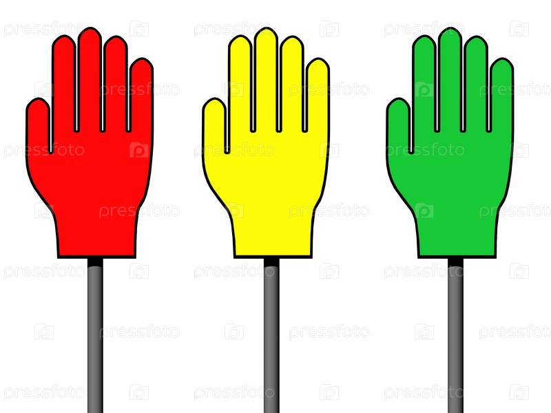 Красный, желтый и зеленый знаки раскрытой ладони на белом фоне