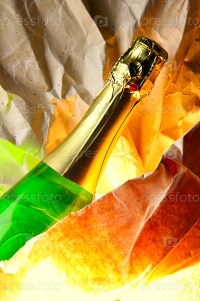 Бутылка шампанского на фоне мятой бумаги