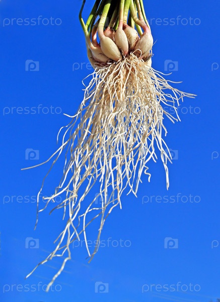 Корни чеснока на голубом фоне