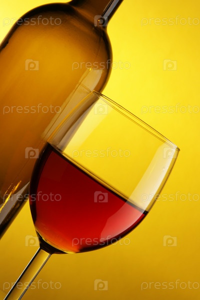 Бутылка и бокал с красным вином на желтом фоне