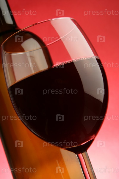 Бутылка и бокал красного вина на ярком фоне