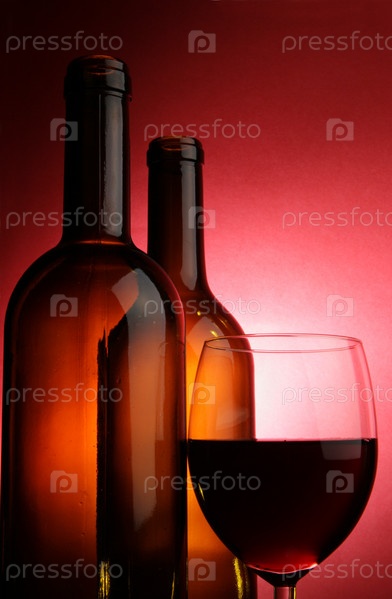 Бутылки и бокал красного вина на ярком фоне