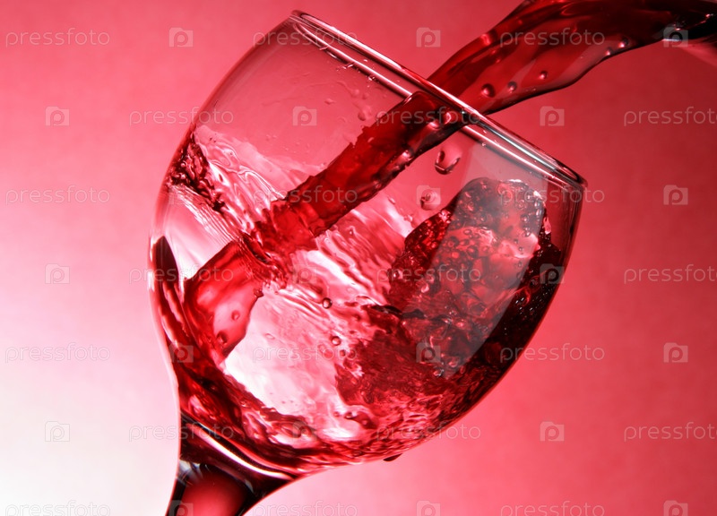 Бокал, наполняющийся красным вином, на ярком фоне