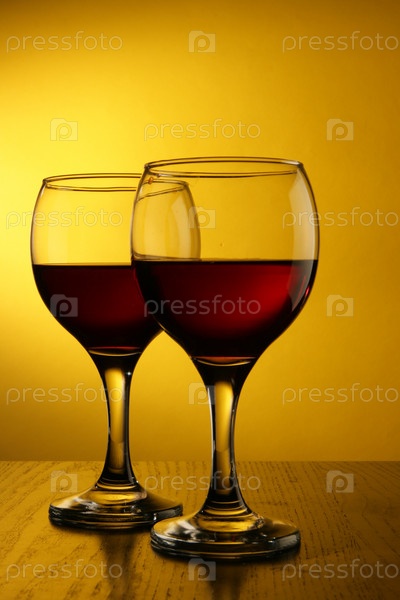 Два бокала красного вина на желтом фоне