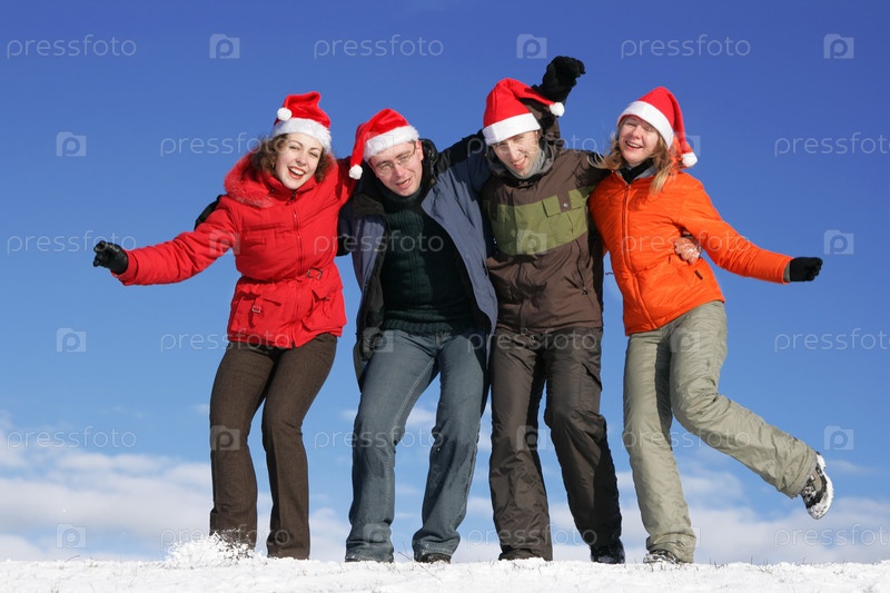 Друзья в новогодних колпаках позируют на вершине горы