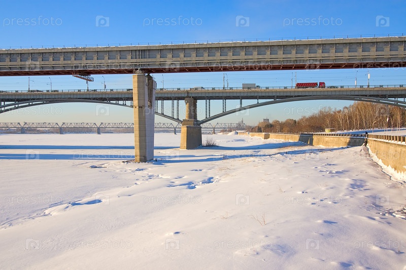 Два моста через реку, зима, Россия