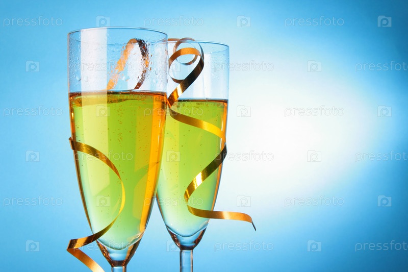 Два бокала шампанского с золотой лентой на голубом фоне
