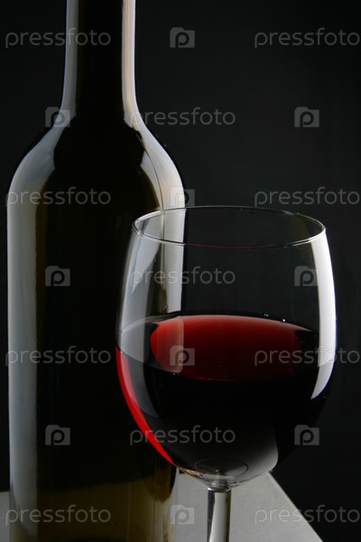 Бокал красного вина и бутылка крупным планом на черном фоне